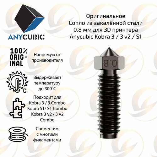 Сопло 0,8 мм из закалённой стали для 3D-принтера Anycubic Kobra 3 — это высококачественное сопло, разработанное специально для использования с 3D-принтерами Anycubic Kobra 3.