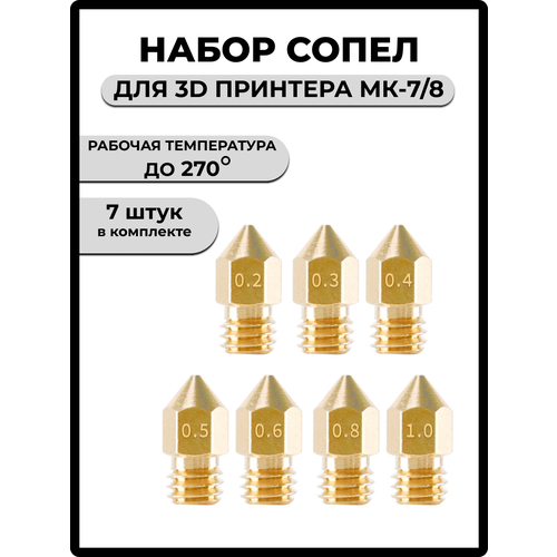 Набор сопел для 3D принтера MK-8 - это качественные расходные материалы и аксессуары, которые предназначены для использования с 3D-принтерами. В комплект входит 7 латунных сопел, которые обеспечивают превосходную производительность и долговечность.