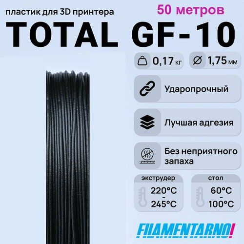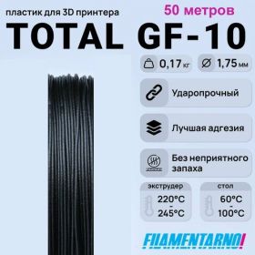 Ударопрочный стеклонаполненный (10%) композит на основе TPU с термостойкостью до 110oС для печати крупных шестерён, прочных корпусов, механически нагруженных деталей, аэродинамических обвесов для автомобилей. Обладает высокой химической стойкостью к растворам кислот и щелочей, жирам, маслам, ксилолу, дизельному топливу. Ограниченно к бензину, керосину, ацетону, дихлометану. Благодаря низкой усадке (до 0.9%), хорошей межслойной адгезии и высокой абразивной стойкости, пластик TOTAL GF-10 станет прекрасной альтернативой композитам на основе полиамидов. Отлично поддаётся сверлению, нарезанию резьбы.