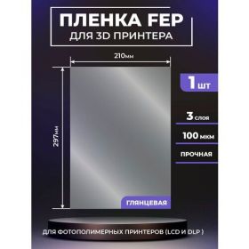 FEP пленка для фотополимерной печати обладает антиадгезионными свойствами и высокой прочностью, что позволяет выполнить построение 3D модели с наибольшей точностью. Пленка для 3D принтера устойчива к воздействию химических соединений (в том числе к фотополимерам и растворителям) и к ультрафиолету. Пленка для 3D печати FEP не темнеет и не деформируется даже после нескольких циклов печати. У пленки 2 защитных слоя с обеих сторон, которые нужно обязательно удалить перед печатью. Данные слои защищают пленку от царапин и попадания пыли при транспортировке. Подходит для DLP /SLA/ LCD печати.