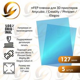 nFEP-плёнка — это усовершенствованный вариант классической FEP-плёнки, обладающий сниженной адгезией и увеличенным сроком службы. Она используется в LCD/DLP/SLA 3D-принтерах в качестве прозрачного барьера между источником УФ-света и смолой, улучшая отслоение слоёв и повышая точность печати. Благодаря улучшенному составу, nFEP обеспечивает более стабильную и гладкую поверхность, сокращает вероятность брака при печати и позволяет печатать быстрее и с большей детализацией.