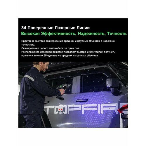 【34+7 линий синего лазера для эффективности и детализации】 34 поперечные лазерные линии обеспечивают быстрое сканирование средних и крупных объектов, а 7 параллельных лазерных линий улучшают частичное HD-сканирование, повышая эффективность сканирования и детализацию благодаря передовой технологии кодирования и декодирования лазерных линий.