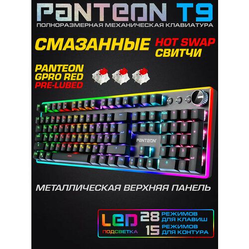 JETACCESS PANTEON T9 – механическая игровая клавиатура. Кнопки работают на красных свитчах OUTEMU Red Switches, которые отличаются высоким ресурсом наработки на отказ, минимальным расстоянием между точкой срабатывания и точкой сброса, а также негромким кликом. Усилие на срабатывание 40 г обеспечивает комфорт в использовании, а малое расстояние до точки срабатывания - мгновенную реакцию на любое действие пользователя. С механической клавиатурой PANTEON® T9 победа становится ближе Механические переключатели OUTEMU Red Switches с ресурсом до 40 млн нажатий гарантируют мгновенное и четкое срабатывание. Колпачки клавиш изготовлены по технологии двойного литья, что обеспечивает отличную читаемость символов, а также длительный срок службы даже при многочасовом ежедневном использовании. Уровень прозрачности внутреннего (светлого) пластика, формирующего сами символы, подобран таким образом, что обеспечивает их отличную читаемость при выключенной подсветке и достаточную яркость при ее включении. Модель PANTEON® T9 обладает функцией неограниченного анти-гостинга. Это открывает широчайшие игровые возможности — нажатие на каждую клавишу анализируется платой отдельно, что позволяет при управлении игровыми действиями одновременно нажимать любое количество клавиш, не опасаясь за их некорректную регистрацию или искажение последовательности нажатия. Led-подсветка Клавиатура PANTEON® T9 оснащена независимой двухзонной подсветкой. Режимы и цвета свечения контура клавиатуры и клавиш можно настраивать отдельно друг от друга. Для зоны расположения клавиш предусмотрено 20 вариантов динамической и статической многоцветной подсветки. Для зоны контурной подсветки можно настроить не только динамические и статические многоцветные режимы, но и один из предустановленных одноцветных режимов (в статике или динамике). Еще одним из безусловных преимуществ являются 8 запрограммированных режимов игровой подсветки клавиш. При выборе одного из таких режимов будут подсвечиваться лишь несколько наиболее часто используемых в различных играх клавиш.