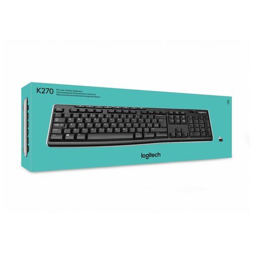 Беспроводная клавиатура Logitech® K270. Клавиатура надежно подключается по беспроводной связи независимо от того. где вы находитесь. Миниатюрный приемник Logitech Unifying настолько мал, что его можно вообще не отключать от ноутбука. Кроме того, к нему легко подключить еще одну совместимую мышь или клавиатуру, не путаясь в нескольких USB-приемниках. Технология беспроводной связи Logitech Advanced на частоте 2,4 ГГц обеспечивает стабильное подключение практически без потерь сигнала на расстоянии до 10 метров*. Устройство может работать целых два года без замены батарей**. Клавиатура подключается по технологии Plug-and-play за считанные секунды, а восемь специальных клавиш облегчают выполнение повторяющихся операций. Благодаря привычной полноразмерной раскладке с цифровым блоком все нужные клавиши расположены именно там, где вы и предполагаете. Устройство разработано согласно высочайшим стандартам качества и надежности, принятым компанией Logitech. Клавиатура рассчитана на длительный срок эксплуатации и защищена от попадания воды***, а благодаря специальному защитному покрытию надписи на клавишах не выгорают. * Радиус действия беспроводной связи зависит от окружающих условий и используемого компьютера. ** Время работы батареи клавиатуры рассчитано исходя из двух миллионов нажатий клавиш в год при работе в офисе. При других условиях эксплуатации этот показатель может отличаться от указанного. *** Протестировано при определенных ограничениях (попадание не более 60 мл жидкости). Не погружайте клавиатуру в жидкость.