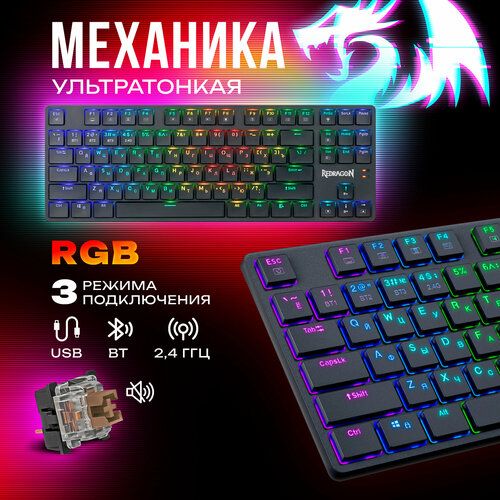 Очень компактная беспроводная (Bluetooth и радиоканал 2.4GHz) механическая клавиатура с RGB подсветкой. Тихие и тонкие коричневые(Slim) переключатели идеально подойдут как для игр, так и для работы.