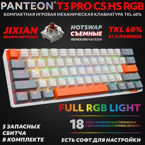 PANTEON® T3 PRO CS HS RGB – механическая игровая клавиатура с RGB-подсветкой. Трендовый игровой форм-фактор копуса TKL (60%) придется по душе любителям гейминга. При этом, несмотря на сокращенное количество клавиш, функционал полноразмерной клавиатуры сохранен благодаря сочетаниям мультифункциональных клавиш с клавишей FN. Клавиши PANTEON® T3 PRO CS HS RGB работают на съемных коричневых свитчах JIXIAN Brown Switches, которые отличаются высоким ресурсом наработки на отказ, минимальным расстоянием между точкой срабатывания и точкой сброса, а также приятным тактильным откликом в точке срабатывания. Усилие на срабатывание 50 г обеспечивает мгновенную реакцию на любое действие пользователя. Hot Swap - опция, которая позволяет быстро и без проблем заменить вышедший из строя свитч или установить свитч другого цвета. Активация стрелок После подключения клавиатуры активируется предустановленный режим работы. В этом режиме клавиши «Alt», «Ctrl», «Меню» и «/,» работают в базовом режиме. Для того, чтобы активировать стрелки, необходимо нажать и удерживать 3 секунды сочетание клавиш FN + правый SHIFT (пока клавиши «Alt», «Ctrl», «Меню» и «/,» не замигают). Возврат к основным функциям клавиш производится также сочетанием клавиш FN + правый SHIFT. Подсветка FULL RGB Сочетаниеклавиш FN+Tab позволяет переключаться между 18 предустановленными многоцветными режимами свечения. При помощи сочетания FN+Enter можно переключать предустановленные статические однотонные режимы подсветки. Всего доступно 8 цветов. Анти-гостинг Неограниченный анти-гостинг открывает широчайшие игровые возможности — нажатие на каждую клавишу анализируется платой отдельно. Благодаря этому при управлении игровыми действиями можно одновременно нажимать любое количество клавиш. Программное обеспечение Фирменный софт позволяет тонко настраивать клавиатуру - менять функционал клавиш, записывать собственные макросы и настраивать подсветку. ПО доступно для скачивания на сайте в разделе “Скачать ПО”.