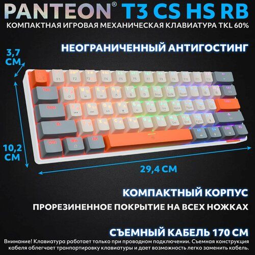 PANTEON T3 RS HS RB – механическая игровая клавиатура с LED-подсветкой RAINBOW LIGHT. Трендовый игровой форм-фактор копуса TKL (60%) придется по душе любителям гейминга. При этом, несмотря на сокращенное количество клавиш, функционал полноразмерной клавиатуры сохранен благодаря сочетаниям мультифункциональных клавиш с клавишей FN. Клавиши PANTEON® T3 СS HS RB работают на съемных коричневых свитчах JIXIAN Brown Switches, которые отличаются высоким ресурсом наработки на отказ, минимальным расстоянием между точкой срабатывания и точкой сброса, а также приятным тактильным откликом в точке срабатывания. Усилие на срабатывание 50 г обеспечивает мгновенную реакцию на любое действие пользователя. Hot Swap - опция, которая позволяет быстро и без проблем заменить вышедший из строя свитч или установить свитч другого цвета. Активация стрелок После подключения клавиатуры активируется предустановленный режим работы. В этом режиме клавиши «Alt», «Ctrl», «Меню» и «/,» работают в базовом режиме. Для того, чтобы активировать стрелки, необходимо нажать и удерживать 3 секунды сочетание клавиш FN + правый SHIFT (пока клавиши «Alt», «Ctrl», «Меню» и «/,» не замигают). Возврат к основным функциям клавиш производится также сочетанием клавиш FN + правый SHIFT. Подсветка RAINBOW Сочетание клавиш FN+\|/ позволяет переключаться между 19предустановленными режимами свечения. Настройка яркости подсветки производится с помощью сочетания клавиш FN+ “[{” или “]}”. Скорость воспроизведения динамических эффектов подсветки изменяется при помощи сочетаний FN+ “ : ” или “ ‘ ” ”. Анти-гостинг Неограниченный анти-гостинг открывает широчайшие игровые возможности — нажатие на каждую клавишу анализируется платой отдельно. Благодаря этому при управлении игровыми действиями можно одновременно нажимать любое количество клавиш.