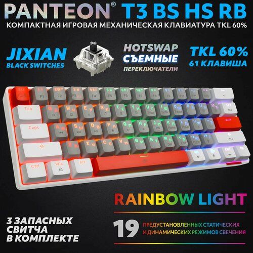 PANTEON T3 BS HS RB – механическая игровая клавиатура с LED-подсветкой RAINBOW LIGHT. Трендовый игровой форм-фактор копуса TKL (60%) придется по душе любителям гейминга. При этом, несмотря на сокращенное количество клавиш, функционал полноразмерной клавиатуры сохранен благодаря сочетаниям мультифункциональных клавиш с клавишей FN. Клавиши PANTEON T3 BS HS RB работают на линейных чёрных свитчах JIXIAN Black Switches, которые отличаются бóльшим усилием на нажатие (около 60 г), благодаря которому многие геймеры предпочитают именно их. Такой показатель обеспечивает защиту от случайных нажатий во время игры, а также прекрасные тактильные ощущения. Hot Swap - опция, которая позволяет быстро и без проблем заменить вышедший из строя свитч или установить свитч другого цвета. Активация стрелок После подключения клавиатуры активируется предустановленный режим работы. В этом режиме клавиши «Alt», «Ctrl», «Меню» и «/,» работают в базовом режиме. Для того, чтобы активировать стрелки, необходимо нажать и удерживать 3 секунды сочетание клавиш FN + правый SHIFT (пока клавиши «Alt», «Ctrl», «Меню» и «/,» не замигают). Возврат к основным функциям клавиш производится также сочетанием клавиш FN + правый SHIFT. Подсветка RAINBOW Сочетание клавиш FN+\|/ позволяет переключаться между 19предустановленными режимами свечения. Настройка яркости подсветки производится с помощью сочетания клавиш FN+ “[{” или “]}”. Скорость воспроизведения динамических эффектов подсветки изменяется при помощи сочетаний FN+ “ : ” или “ ‘ ” ”. Анти-гостинг Неограниченный анти-гостинг открывает широчайшие игровые возможности — нажатие на каждую клавишу анализируется платой отдельно. Благодаря этому при управлении игровыми действиями можно одновременно нажимать любое количество клавиш.