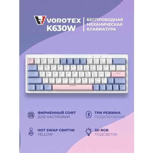 НАЙТИ ВЫГОДНЕЕ - Клавиатура игровая беспроводная VOROTEX K630W Yellow Switch, русская раскладка (Белый, фиолетовый)