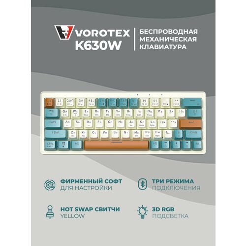 Клавиатура VOROTEX K630W Yellow Switch - это механическая беспроводная клавиатура высокого класса, которая сочетает в себе стильный дизайн, потрясающую RGB-подсветку и удобство использования.