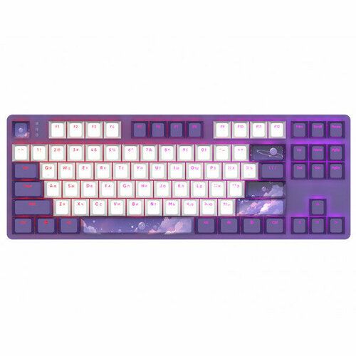 Клавиатура классно смотрится благодаря гармоничному сочетанию фиолетового и белого цвета клавиш. Плюс к тому, кнопки пробел, Enter, Escape и левый Shift украшены стильными принтами, которые хорошо подходят под общий вид.