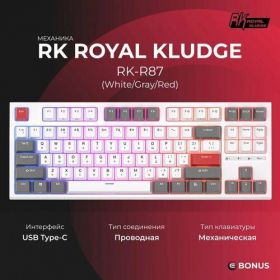 Классическая TKL) (без цифрового блока - 80%) механическая клавиатура Royal Kludge RKR87 - проводное подключение (съёмный USB-C кабель), 87 клавиш, белая, переключатели RK Red, EN - двойное литье (Double Shot) / RU - лазерная гравировка, горячая замена переключателей 3/5 pin, настраиваемая RGB подсветка, порт USB-C (1), 2 слоя вспененного звукопоглощающего материала, размеры 366,26 x 138,74 x 40,14 мм, вес 920 г.