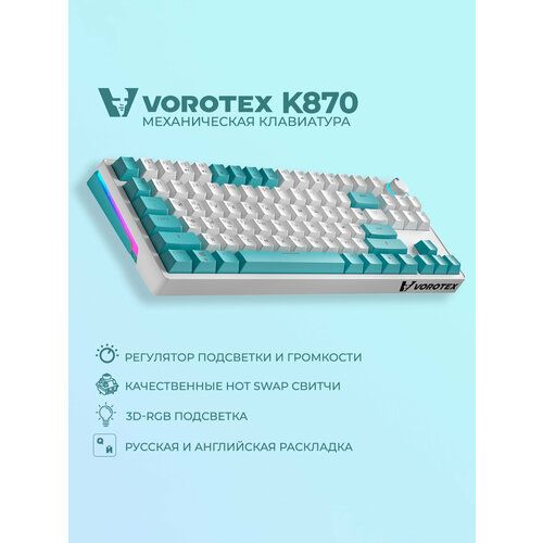 Клавиатура игровая проводная VOROTEX K870 - это механическая клавиатура, созданная специально для геймеров. Она имеет компактный размер, занимая мало места на столе, благодаря формату 80%. Такая TKL клавиатура позволяет игрокам иметь больше свободного пространства для движений мышью.