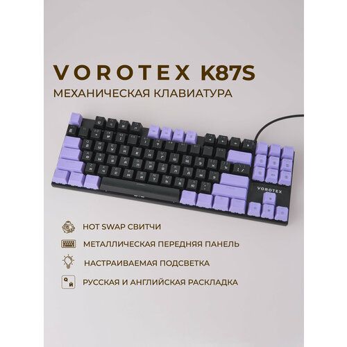 Найти - Клавиатура игровая проводная VOROTEX K87S Brown Switch, русская раскладка (Чёрный, фиолетовый)