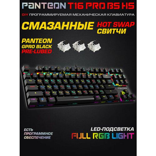 Свитчи HUANO Black SWITCHES HOT SWAP Клавиши PANTEON® T16 PRO BS HS работают на черных свитчах HUANO Black Switches. Основной отличительной чертой HUANO Black является усилие на нажатие в точке срабатывания около 60г. Такая особенность обеспечивает исключительную точность при работе с клавиатурой, т. к. случайные нажатия полностью исключены. HUANO Black - это особенное тактильно приятное нажатие и четкость срабатывания свитча при отсутствии усталости пальцев. Подсветка RGB LIGHT Сочетание клавиш FN + INS позволяет переключаться между 14 предустановленными вариантами свечения. Сочетание клавиш FN + 1.5 включает один из 5 настраиваемых игровых режимов. Подробнее о настройке читайте в руководстве пользователя. Также подсветку можно настраивать при помощи программного обеспечения. Неограниченный антигостинг Модель PANTEON T16 PRO обладает функцией неограниченного анти-гостинга. Это открывает широчайшие игровые возможности — нажатие на каждую клавишу анализируется платой отдельно, что позволяет при управлении игровыми действиями одновременно нажимать любое количество клавиш, не опасаясь за их некорректную регистрацию или искажение последовательности нажатия. Колпачки двойное литье Колпачки клавиш изготовлены по технологии двойного литья, что обеспечивает отличную читаемость символов, а также длительный срок службы даже при многочасовом ежедневном использовании. Уровень прозрачности внутреннего (светлого) пластика, формирующего сами символы, подобран таким образом, что обеспечивает их отличную читаемость при выключенной подсветке и достаточную яркость при ее включении. Программное обеспечение фирменный софт позволяет тонко настраивать клавиатуру - менять функционал клавиш, записывать собственные макросы и настраивать подсветку. ПО доступно для скачивания на сайте panteon.in. Возможность кастомизации В продаже имеются сменные свитчи, колпачки клавиш различных цветов, а также дополнительные верхние панели. Это позволяет собрать свое собственное технически и эстетически уникальное устройство.