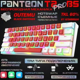 PANTEON® T2 PRO BS – механическая программируемая игровая TKL-клавиатура со сменными свитчами и RGB-подсветкой. Трендовый игровой форм-фактор корпуса TKL (60%) придется по душе любителям гейминга. Малый размер позволяет во время игры максимально удобно расположить клавиатуру под левой рукой под углом 45° и более. При этом, несмотря на сокращенное количество клавиш, функционал полноразмерной клавиатуры сохранен благодаря сочетаниям мультифункциональных клавиш с клавишей FN. Например, для того, чтобы воспроизвести функцию клавиши F2, необходимо нажать сочетание FN+2. Встроенный аккумулятор емкостью 1450 mAh обеспечивает до 14 часов непрерывной игры при включенной подсветке и до 30 часов без подсветки в беспроводном режиме (см. инструкцию). Клавиатура PANTEON® T2 PRO поддерживает 3 различных варианта подключения: 1. Классическое проводное подключение (активируется автоматически при использовании кабеля). 2. Беспроводное подключение при помощи USB-передатчика по радиоканалу 2,4 Ггц. Для активации режима необходимо отключить кабель, подключить USB-передатчик к гнезду USB и нажать сочетание клавиш FN+Y. 3. Беспроводное соединение Bluetooth 5.0. Технология Bluetooth позволяет подключить клавиатуру к устройствам, в которых отсутствуют порты USB на платформах Android, Mac, iOS, Windows*. Можно выполнить сопряжение поочередно с 3 устройствами при помощи сочетания клавиш FN + E / R / T и переключаться между ними используя соответствующие сочетания. Свитчи OUTEMU BLACK SWITCHES HOT SWAP Клавиши PANTEON® T2 PRO BS работают на черных свитчах OUTEMU Black Switches. Основной отличительной чертой OUTEMU Black является усилие на нажатие в точке срабатывания около 60г. Такая особенность обеспечивает исключительную точность при работе с клавиатурой, т. к. случайные нажатия полностью исключены. OUTEMU Black - это особенное тактильно приятное нажатие и четкость срабатывания свитча при отсутствии усталости пальцев. Hot Swap - опция, которая позволяет быстро и без проблем заменить вышедший из строя свитч или установить свитч другого цвета. Особенности корпуса Клавиатура обладает усиленным каркасом и массой 430 граммов. Благодаря прорезиненному покрытию всех ножек клавиатура всегда прочно фиксируется на столе и сдвинуть ее в пылу азарта достаточно сложно. Геометрия клавиш обеспечивает максимальный комфорт в игре и работе. Анти-гостинг Неограниченный анти-гостинг открывает широчайшие игровые возможности — нажатие на каждую клавишу анализируется платой отдельно. Благодаря этому при управлении игровыми действиями можно одновременно нажимать любое количество клавиш. Подсветка FULL RGB LIGHT 22 режима подсветки доступно без использования программного обеспечения, переключать режимы можно кнопкой управления подсветки . Сочетание клавиш Fn+Tab переключает цвета в рамках режима. При использовании программного обеспечения доступно 30 различных режимов, а также можно создать пользователький режим подсветки с использованием палитры RGB.