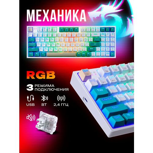 Уникальный дизайн, белые кастомные почти бесшумные свичи Redragon, беспроводные протоколы связи (BT, 2.4G), крутая RGB-подсветка — это Veigar черный для области кнопки и белый/прозрачный для символов
