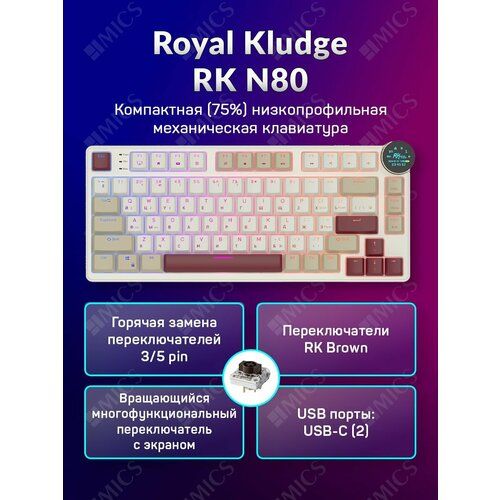 Компактная низкопрофильная механическая клавиатура Royal Kludge RK N80 - 3 типа подключения (Bluetooth, радиоканал 2,4 ГГц, провод), 80 клавиш, цвет Rosy Clouds, переключатели RK Brown, Top Mount; EN сквозная подсветка/ RU без подсветки, горячая замена переключателей 3/5 pin, настраиваемая RGB подсветка, два порта USB-С, 3 слоя звукопоглощающего материала, аккумулятор 3750 mAh, многофункциональный вращающийся переключатель с экраном.
