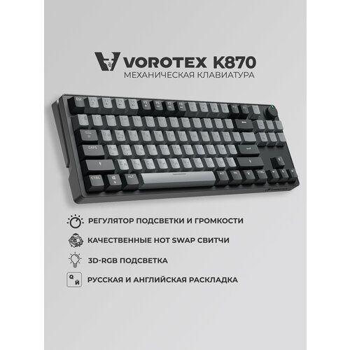 Клавиатура игровая проводная VOROTEX K870 - это механическая клавиатура, созданная специально для геймеров. Она имеет компактный размер, занимая мало места на столе, благодаря формату 80%. Такая TKL клавиатура позволяет игрокам иметь больше свободного пространства для движений мышью.