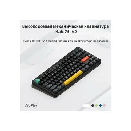 NuPhy Halo75 V2Дизайн: Halo 2.0, магнитная табличка с подсветкой, двухцветная полупрозрачная нижняя часть корпуса. Прошивка: QMK/VIA, Сигнал RGBБеспроводная скорость возврата: 2,4 г, 1000 ГцСтруктура: Структура прокладкиВнутренний резервуар: доска для ходьбы Pom, сэндвич-хлопок Poron, нижняя подкладка стержня IXPE, полупрозрачная нижняя подкладка стержня, хлопок сиденья стержня Poron, нижний силикон. Колпачок клавиатуры: высота mSA, невидимое пространство, клавиши «слепой зоны» со светодиодной подсветкойДревко: Малиновое древко/Лимонное древко/Мятное древко/Вишнёвое киноварное древко. Вес: 1,02 кг