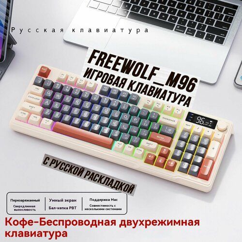 Найти - Игровая беспроводная мембранно-механическая клавиатура FreeWolf_M96, RGB подсветка, инфо-дисплей. Бежевая Русский