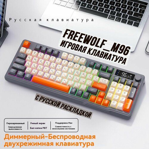 Найти - Игровая беспроводная мембранно-механическая клавиатура FreeWolf_M96, RGB подсветка, инфо-дисплей. Бежевая Русский