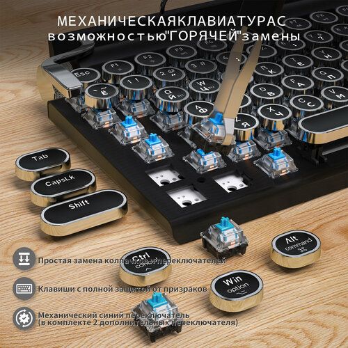 Ощущение, как на настоящей пишущей машинке: Эта механическая клавиатура в стиле ретро позволяет печатать на ней, как на настоящей пишущей машинке. Синие переключатели обеспечивают приятный щелчок и тактильную отдачу, а плавный и быстрый набор текста требует минимальной усталости пальцев и кистей. Он идеально подходит для тех, кто много пишет или печатает на машинке, и делает набор текста одновременно приятным и аутентичным