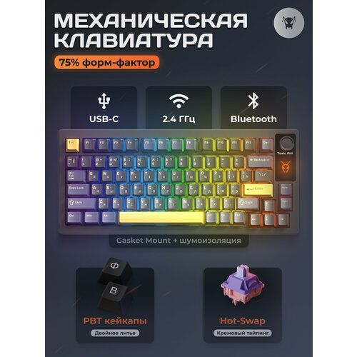Механическая клавиатура Arke75 сочетает компактный формат 75% с удобной русско-английской раскладкой, что делает ее универсальным решением для работы и развлечений. Эта модель оснащена программируемыми переключателями hot-swap, позволяющими быстро менять свитчи без лишних усилий.