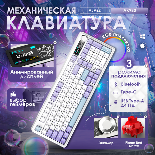 AJAZZ AK980 совместима с операционными системами Windows и MacOS. Для подключения механической клавиатуры к компьютеру воспользуйтесь Bluetooth соединением, входящим в комплект кабелем USB Type-C или WiFi адаптером USB 2.4 ГГц, расположенным на обратной стороне клавиатуры. Вы также можете использовать пуллер для замены свитчей и кейкапов клавиатуры.