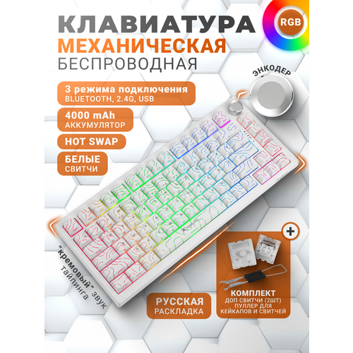 Найти - Клавиатура механическая беспроводная игровая, RGB подсветка, Hot-Swap, Type-C + 2.4G + Bluetooth, белая, белые свитчи