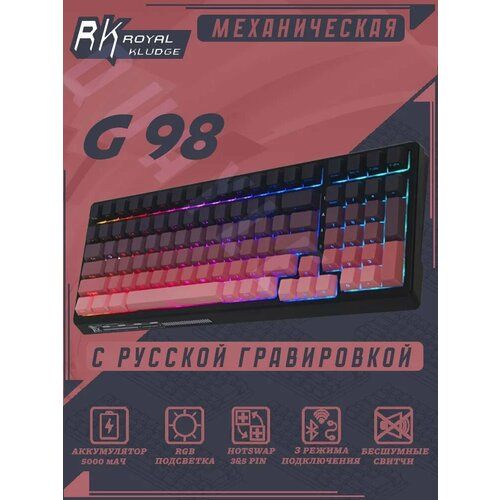 Royal Kludge G98 - стильная и функциональная игровая клавиатура с RGB подсветкой. Она оснащена 98 клавишами, включая блок NumPad, и подключается через Bluetooth, 2,4 ГГц или USB Type-C.