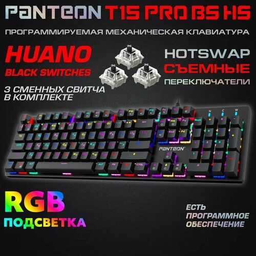 Свитчи HUANO BLACK SWITCHES HOT SWAP Клавиши PANTEON® T15 PRO BS HS работают на черных свитчах HUANO Black Switches. Основной отличительной чертой HUANO Black является усилие на нажатие в точке срабатывания около 60г. Такая особенность обеспечивает исключительную точность при работе с клавиатурой, т. к. случайные нажатия полностью исключены. HUANO Black - это особенное тактильно приятное нажатие и четкость срабатывания свитча при отсутствии усталости пальцев. Hot Swap - опция, которая позволяет быстро и без проблем заменить вышедший из строя свитч или установить свитч другого цвета. Подсветка RGB LIGHT Сочетание клавиш FN + INS позволяет переключаться между 14 предустановленными вариантами свечения. Сочетание клавиш FN + 1.5 включает один из 5 настраиваемых игровых режимов. Подробнее о настройке читайте в руководстве пользователя. Также подсветку можно настраивать при помощи программного обеспечения. Неограниченный антигостинг Модель PANTEON T15 PRO обладает функцией неограниченного анти-гостинга. Это открывает широчайшие игровые возможности — нажатие на каждую клавишу анализируется платой отдельно, что позволяет при управлении игровыми действиями одновременно нажимать любое количество клавиш, не опасаясь за их некорректную регистрацию или искажение последовательности нажатия. Колпачки двойное литье Колпачки клавиш изготовлены по технологии двойного литья, что обеспечивает отличную читаемость символов, а также длительный срок службы даже при многочасовом ежедневном использовании. Уровень прозрачности внутреннего (светлого) пластика, формирующего сами символы, подобран таким образом, что обеспечивает их отличную читаемость при выключенной подсветке и достаточную яркость при ее включении. Программное обеспечение фирменный софт позволяет тонко настраивать клавиатуру - менять функционал клавиш, записывать собственные макросы и настраивать подсветку. ПО доступно для скачивания на сайте panteon возможность кастомизации В продаже имеются сменные свитчи, колпачки клавиш различных цветов, а также дополнительные верхние панели. Это позволяет собрать свое собственное технически и эстетически уникальное устройство.