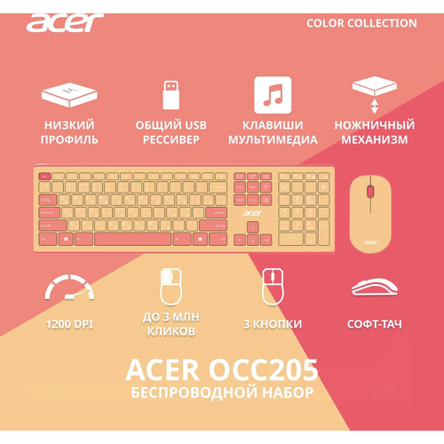 Комплект Acer OCC205 Pink - это компактные беспроводные клавиатура и мышь. Для подключения к компьютеру используется оптический радиомодуль.