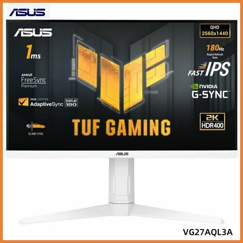 Игровой монитор TUF GAMING VG27AQL3A-W–27 дюймов, QHD (2560x1440), 180 Гц, Быстрый IPS, синхронизация ELMB, 1 мс (GTG), Freesync Premium, совместимый с G-Sync, дисплей VESA AdaptiveSync, 180 Гц, драйвер с регулируемым ускорением, 130% sRGB, дисплей HDR 400