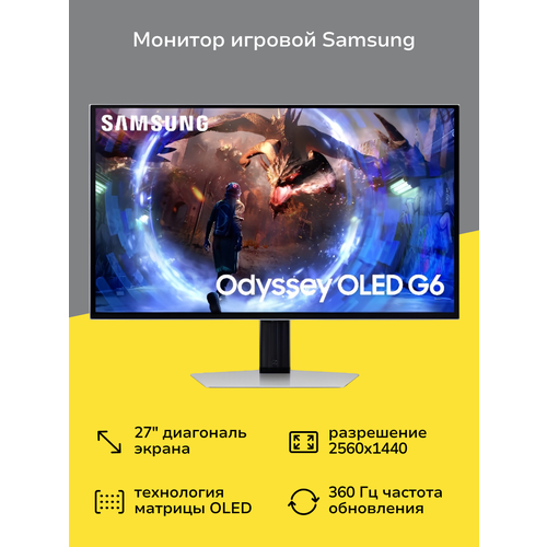 Монитор Samsung S27DG600SI относится к коллекции Odyssey G6, которая объединяет топовые геймерские устройства. Модель оснащена экраном диагональю 27 дюймов с высокой контрастностью и углами обзора 178°. Тонкий корпус с динамической цветной подсветкой на задней панели выполнен из пластика и отделан металлом. Алюминиевая нога-подставка обеспечивает его устойчивость на столешнице и позволяет регулировать наклон, высоту, поворачивать на 90° в портретный режим.