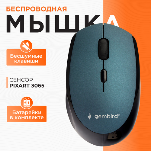 Найти - Мышь беспроводная, синий, бесш. клик, soft touch, 3кн.+колесо-кнопка, 1600DPI, 2,4ГГц, Gembird