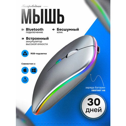 Беспроводная перезаряжаемая Bluetooth + Wireless мышь Booox - компактная симметричная модель, предназначена для комфортного управления функциями ноутбука/компьютера. Поддерживает работу в двух режимах: Bluetooth 5,2 и радио 2,4 ГГц. В комплекте предусмотрен компактный USB приёмник для работы по радио каналу. Работает в радиусе 10 метров. Для питания мыши используется встроенный аккумулятор. Беспроводная мышь со встроенным высокотехнологичным оптическим сенсором работает практически на любой поверхности. Эргономичный корпус разработан для использования как правой, так и левой рукой (рассчитан для левшей). Имеет высокую точность курсора, может анализировать изменения позиций в 700 мм / сек. Мышь не требует дополнительных драйверов для установки. Характеристики: Тип: 2,4 ГГц беспроводной + Bluetooth (двойной режим) Тип датчика: Оптический светодиодный Количество кнопок: 4 Разрешение датчика, dpi: 800/1200/1600 Cветодиодная RGB подсветка Интерфейс: USB Номинальное напряжение: 3,7 В Емкость аккумулятора: 500 мАч Время зарядки: 2 часа Беспроводное расстояние: 10 м Режим Bluetooth: поддержка Windows, MacOS, IOS 13 и выше Режим радио: поддержка почти всех компьютеров, приемник расположен в нижней части мыши Размер, мм: 112x60x25 Материал: ABS пластик