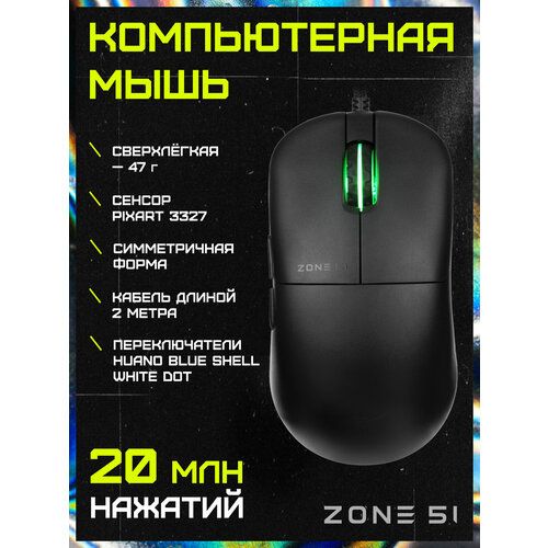 • ZONE 51 Mirror — это стильная и сверхлегкая игровая мышь, выполненная в черном цвете и обладающая эргономичной симметричной формой, рассчитанной на комфортное использование для различных типов хвата. Вес корпуса составляет всего 47 грамм, что обеспечивает минимальную инерцию и максимально предсказуемое управление во время интенсивных игровых сессий.