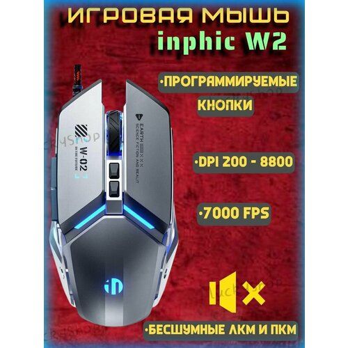 Проводная компьютерная мышь INPHIC W2 с подсветкой :7 цветов плавно переливающейся игровой подсветки; мышка имеет эргономичную форму; кнопка смены разрешения мышки 4800 dpi; прочная симметричная конструкция подходит для долгой работы; длина кабеля 1,5 метра. проводная оптическая мышь подходит и взрослым, и детям для учебы, игр или работы за компьютером и ноутбуком. Эргономичный дизайн подходит для всех видов рук и компьютера. 6 клавиш, 4 вида регулируемых DPI. Настраиваемая макронастройка, идеально подходит для более сложных игр