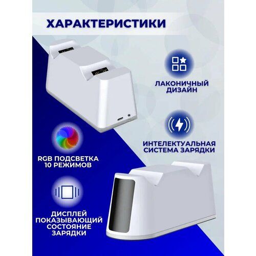 Led дисплей с индикацией заряда При помощи зарядной станции VOLFOX игроки могут заряжать одновременно два контроллера Плейстейшен 5 без проводного подключения к самому устройству. Регулируемая RGB подвсетка придаст особую атмосферу. Зарядная док-станция выполнена из качественных и безопасных материалов, в универсальном белом цвете и будет прекрасным дополнением к игровой консоли пс5. Устройство отличается бережной зарядкой, что поможет продлить срок службы аккумулятора в геймпаде. Led дисплей покажет, когда геймпад PS5 заряжен (если горит индикация, геймпад заряжается, когда индикация погаснет - геймпад зарядился). Совместима не со всеми чехлами для контроллера (может не поступать заряд при надетом чехле, так как контакт зарядного устройства не будет доставать до коннектора, в таком случае необходимо снять защитный кейс с джойстика). Незаменимый аксессуар для вашей консоли