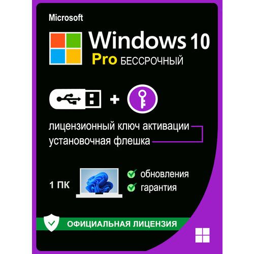 Microsoft Windows 10 Pro с привязкой к учетной записи (бессрочная лицензия). Онлайн активация на официальных дистрибутивах Виндовс, а так же расширенная гарантия на 3 года с момента активации, при соблюдении условий использования ПО. Комплект поставки: ключ активации, установочная USB флешка, инструкция. Этот комплект рекомендуется для активации или установки системы. При необходимости можете скачать образ диска или средство обновления Windows на официальном сайте Майкрософт с помощью нашей инструкции. Ключ Windows 11 легально активирует бессрочную лицензию и открывает доступ ко всем функциям программного обеспечения, лицензия отображается в личном кабинете пользователя. Продукт подходит для x32 и x64 разрядных систем. Мы сотрудничаем с официальными партнёрами Microsoft, поэтому гарантируем безопасность вашей системы и успешную активацию Windows 10 Pro (профессиональная), а на случай каких-либо сложностей оставляем контакты тех. поддержки, которая оперативно ответит в популярных мессенджерах. Данный товар не является Windows 10 Home, Enterprise и Windows 10, а также установочным диском. Доп. информация: Возможно обновление Домашней версии до Профессиональной, процесс описан в инструкции к товару. Лицензия предназначена только для активации операционной системы и не включает в себя программы office - для них требуется отдельный ключ. Активация или переход с Корпоративной версии недоступен, в этом случае потребуется переустановка операционной системы.