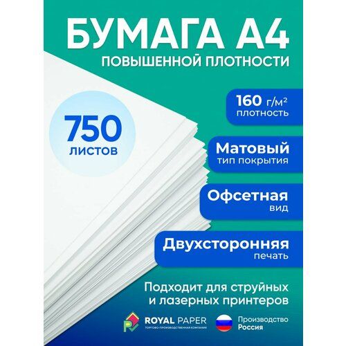 Найти - Бумага офсетная А4 плотная 160 гр/м2, белая офисная, 750 листов - подходит для печати, принтера, рисования и творчества