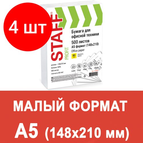 Найти - Комплект 4 шт, Бумага офисная малого формата (148х210), А5, 80 г/м2, 500 л, марка С, STAFF Profit, 149% (CIE), 110446