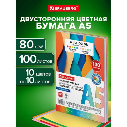 Найти - Цветная бумага А5 набор 10 цветов 100 листов, пастельная двусторонняя 80 г/м2, Brauberg Multicolor, 116406