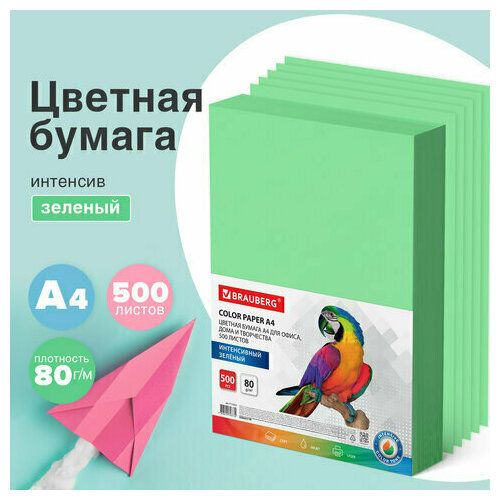 Упакована в пачки по 500 листов формата А4. В упаковке бумага интенсивного тона зеленого цвета. Листы бумаги плотностью 80 г/м2 подходят для офисной техники.