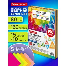 Найти - Цветная бумага для принтера, школы А4 набор 15 цветов 150 листов (15 цветов x 10 листов), двусторонняя для печати, оригами 80 г/м2, Brauberg Multicolor, 116648