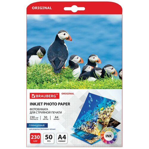 Найти - Фотобумага глянцевая / бумага для печати фото на струйных принтерах, А4, 230 г/м2, односторонняя, 50 листов, Brauberg Original, 363990