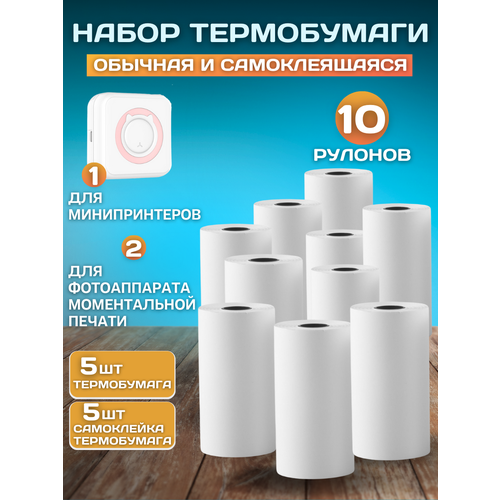 Большой набор - 5 рулонов обычной и 5 рулонов самоклеящейся бумаги 57 мм, для мини принтера для печати фото, рисунков, стикеров, раскрасок и шпаргалок. С помощью самоклеящейся термобумаги для мини принтера можно сделать интересные рисунки, шпаргалки и декоративные элементы, которые можно наклеить на ноутбук, стол или даже на рюкзак. С детского фотоаппарата с помощью термобумаги можно печатать памятные фото и уникальные дизайны. Липкий слой поможет наклеить самоклеящуюся термобумагу. Можно получить отличное качество печати на термобумаге для детского фотоаппарата. Подходит для использования в офисе, студентами, учителями, репетиторами. Можно сразу печатать на термобумаге без чернил, распечатывать на бумаге для мини термопринтера фотографии прямо с телефона или специального фотоаппарата во время школьных занятий, дома или в офисе. Набор термобумаги -отличный подарок подростку и ребенку или студенту на праздник. Обычная и самоклейка. 10 рулонов