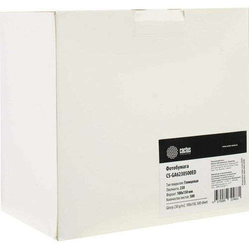 Фотобумага Cactus CS-GA6230500ED, A6, для струйной печати, 500л, 230г/м2, белый, покрытие глянцевое