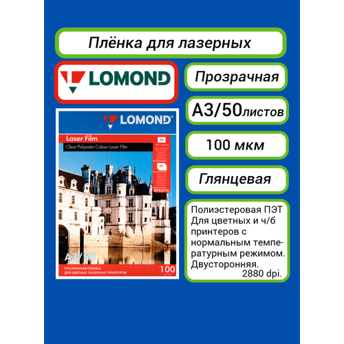 Найти - Пленка для лазерной печати Lomond А3 прозрачная односторонняя для цветных лазерных принтеров (50 листов) 100 мкм (0703315)